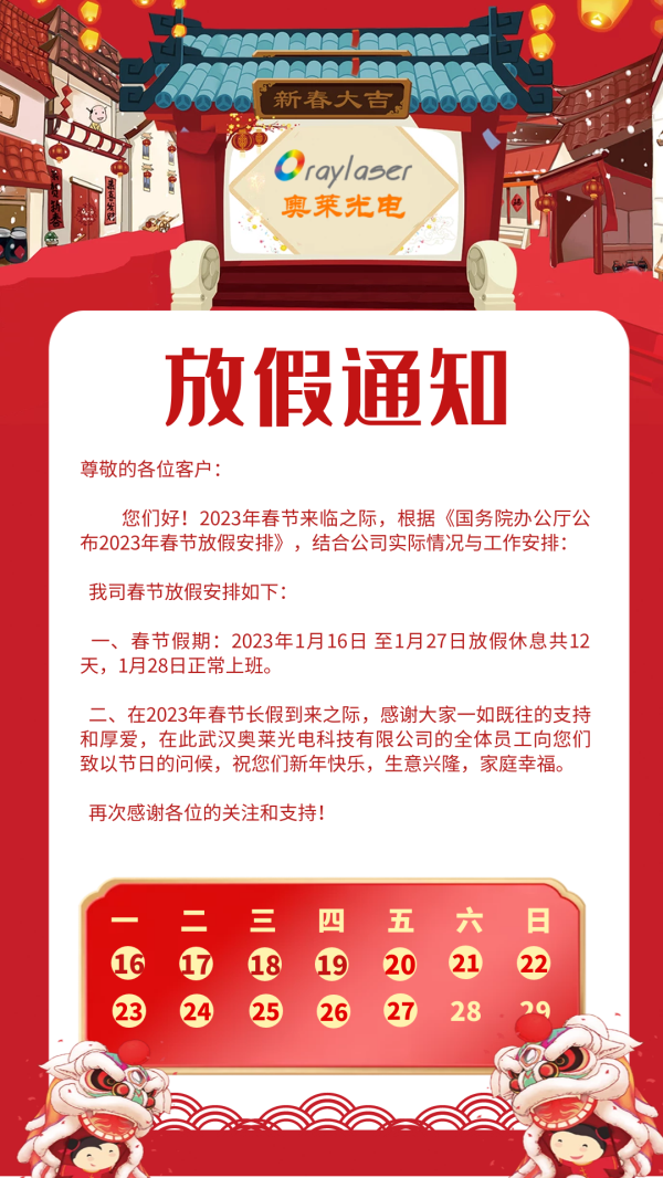 二、在2023年春節(jié)長(zhǎng)假到來(lái)之際,感謝大家一如既往的支持和厚愛(ài),在此武漢奧萊光電科技有限公司的全體員工向您們致以節(jié)日的問(wèn)候,祝您們新年快樂(lè),生意興隆,家庭幸福。